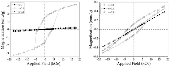 Figure 5 displays the magnetic hysteresis loops at room temperature of sintered pellets obtained from milled mixtures of La2O3, Fe2O3, and SrO for obtaining La1−xSrxFeO3 with different doping levels, x, from 0 to 0.5 mol of strontium. As it is expected, the undoped lanthanum ferrite shows antiferromagnetic behavior, consistent with a dominant antiferromagnetic (AFM) super-exchange (SE) interaction [30], exhibiting a mass magnetic susceptibility of 1.047 × 10−10 m3/kg and a specific magnetization of 0.14 emu/g at 18 kOe. When 0.1 mol of strontium is added to the pure LaFeO3, a weak ferromagnetic behavior is evidenced, with a specific magnetization of 3.15 emu/g at 18 kOe. This modification in the magnetic behavior is attributed to the structural distortions produced by the substitution of lanthanum for strontium, which disrupts the AFM SE interaction, responsible for modifying the magnetic structure of lanthanum ferrite.