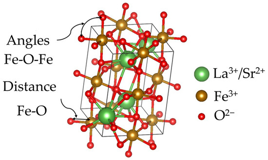 Furthermore, Lataoui et al. [14] proposed that the substitution of La3+ by Sr2+ induces a decrease in the unit cell volume and changes in the lattice size. Similarly, the conductivity increases with the increase in the doping level. Additionally, Paiva et al. [15] reported that there is a transformation of the crystal system from orthorhombic to rhombohedral when the strontium content increases from 0.2 to 0.4 mol for the pellets that were sintered at 1423 K for 2 h. By carrying out an Ab initio study, Ritzmann et al. [16] demonstrated that both the volume of the unit cell and the Fe-O bond length decrease, while the Fe-O-Fe angles increase as the strontium content changes from 0 to 0.5 mol. Additionally, oxygen vacancies are created due to the reduction in Fe ions induced to maintain electroneutrality. On the other hand, the study of the LaxSr1−xFeO3 system shows that the iron valence state gradually shifts from Fe3+ to Fe4+ as the value of x increases, indicating an intermediate valence state for iron. Alternatively, it suggests that the trivalent state of iron remains stable while oxygen vacancies are generated in the lattice to maintain electroneutrality in the compound. The partial substitution of La3+ by Sr2+ facilitates the gradual structural transition from orthorhombic to cubic, accompanied by an increase in oxygen nonstoichiometry [17].