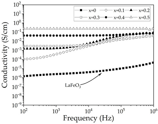 Frequency-dependent electrical conductivity of sintered pellets obtained from samples prepared by mixing La2O3, Fe2O3, and SrO powders at stoichiometric ratios, milling for 5 h, pressing, and sintering at 1473 K for 4 h for obtaining La1−xSrxFeO3 with 0 ≤ x ≤ 0.5, Δx = 0.1.