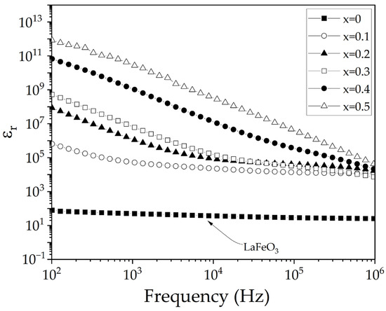 Frequency-dependent relative permittivity of sintered pellets obtained from samples prepared by mixing La2O3, Fe2O3, and SrO powders at stoichiometric ratios, milling for 5 h, pressing, and sintering at 1473 K for 4 h for obtaining La1−xSrxFeO3 with 0 ≤ x ≤ 0.5, Δx = 0.1.