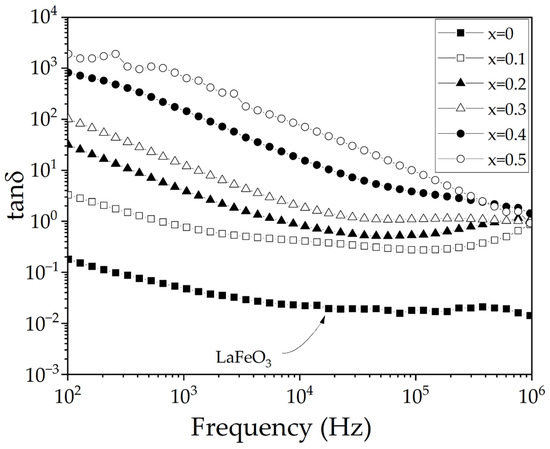 Frequency-dependent tanδ of sintered pellets, at room temperature, obtained from samples prepared by mixing La2O3, Fe2O3, and SrO powders at stoichiometric ratios, milling for 5 h, pressing, and sintering at 1473 K for 4 h for obtaining La1−xSrxFeO3 with 0 ≤ x ≤ 0.5, Δx = 0.1.