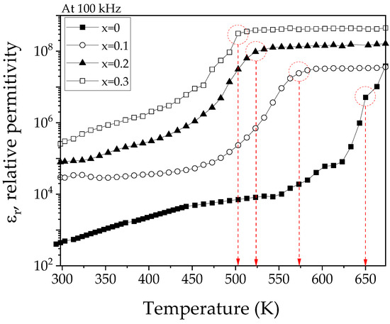 To evaluate the effect of strontium doping on the relative permittivity, Figure 10 presents the curves obtained at 100 KHz for sintered La1−xSrxFeO3 pellets, with x ranging from 0 to 0.3 mol of strontium, in the temperature range from 298 K to 675 K. As expected, all samples show a gradual increase in relative permittivity with increasing temperature until a point is reached where the curves show a plateau behavior. Beyond this point, permittivity remains constant, which is attributed to the transition from the ferroelectric to the paraelectric state. It is important to highlight that the temperature transition decreases from 650 K to 510 K as the strontium concentration increases from 0 to 0.3 mol. This reduction is ascribed to the decrease in the system’s tetragonality due to Sr2+ substitution, which weakens the intrinsic dipole moment and consequently lowers the transition temperature. At a frequency of 100 kHz, the dominant polarization mechanism in ferroelectric materials such as La1−xSrxFeO3 is ionic or displacement polarization. This mechanism involves the cooperative displacement of ions within the crystal structure, resulting in spontaneous polarization. This behavior is characteristic of displacement-type ferroelectric materials, where polarization arises from structural changes in the crystal lattice.