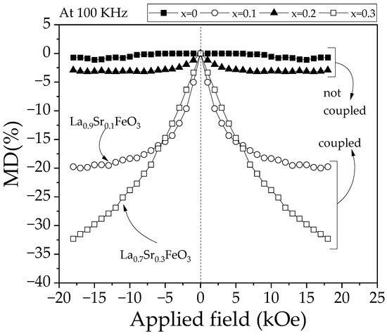 Magnetodielectric coupling (MD) of sintered pellets obtained from samples prepared by mixing La2O3, Fe2O3, and SrO powders at stoichiometric ratios, milling for 5 h, pressing, and sintering at 1473 K for 4 h for obtaining La1−xSrxFeO3 with 0 ≤ x ≤ 0.3, Δx = 0.1 at 100 kHz.
