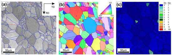 Figure 1b), and (iii) a very low value of the GOS parameter (internal grain orientation spread ≤ 1°), which is specific for a fully recrystallized material (