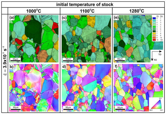 −1 (the last one was not used for T = 1280 °C). For all hot rolling conditions, the total strain value (i.e., expressed as a relative thickness reduction) was 0.3, and it was set in one pass. To eliminate the possibility of post-dynamic recrystallization in the material, after each hot rolling operation, the samples were immediately (in less than 1 s) cooled in a water bath. Then, an electric discharge machining was used to cut the obtained strips in a plane perpendicular to the rolling direction located in the middle of the length of the rolled material. Metallographic cuts were ground on SiC papers and mechanically polished using diamond suspensions of 3 µm and SiO