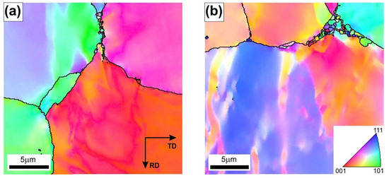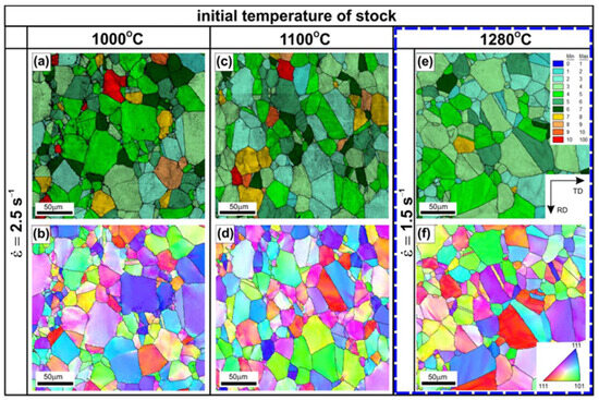 24], this value was not sufficient to initiate recrystallization processes. Consequently, for these rolling conditions (i.e., 1100 °C of the stock and