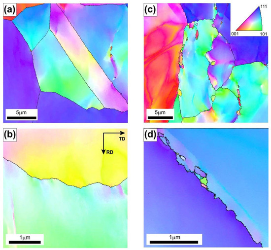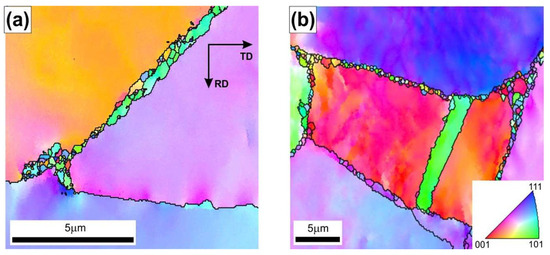 39], according to whom such structural features are specific to a deformation temperature lower than the critical temperature for initiating the dynamic recrystallization process. The serration of grain primary boundaries was also observed after the hot rolling at T = 1100 °C and at a strain rate of 9.9 × 10