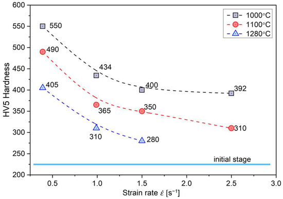 Figure 8). Regardless of the applied hot rolling temperature, the increase in the strain rate resulted in a decrease in the strain hardening of the material. It was mostly visible in the case of the process conducted at the highest strain rate (i.e., 2.5 s