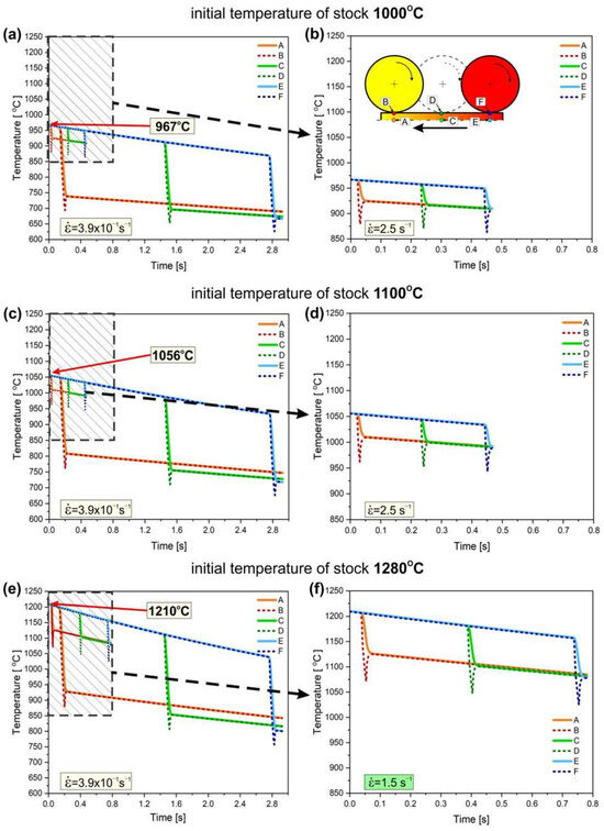 −1). Under these conditions, the temperature gradient was the most significant, and the contact time between the rollers and the workpiece material was the longest. Consequently, the temperature in the core of the material decreased by approximately 280 °C at the beginning and 410 °C at the end of the sample. Notably, despite the largest temperature change among the analyzed cases, its value remained above 800 °C throughout the deformation process. The increase in the strain rate for this processing temperature resulted in a significantly higher value of the temperature during deformation (i.e., above 1070 °C for