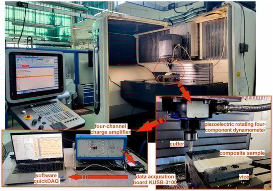 Milling operations of polymer composites were carried out on a DMG DMU 100 monoBLOCK milling center (Rzeszów, Poland). A hydraulic machine vice was mounted in the milling center workspace. The composite samples were fixed in the jaws of the vice. Cutting forces were measured using a Kister 9123C (Rzeszów, Poland) piezoelectric rotating four-component dynamometer with a maximum rotational speed of 10,000 rev/min. The piezoelectric rotating dynamometer was mounted directly in the spindle of the milling center. The dynamometer was connected to a four-channel charge amplifier, Kistler 5223B. Combined with a KUSB-3100 data acquisition board as a measurement card and quickDAQ software, it enabled the recording of cutting force curves. The tests were conducted with a sampling frequency of 10 kHz. The experimental setup is shown in Figure 3.