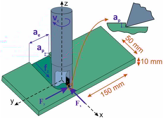Figure 4 also shows the values of ap, i.e., the depth of cut, and ae, i.e., the width of cut that was equal to the diameter of the milling cutter. Complete symmetric milling was performed to prevent the effect of overlapping machined bands on force signal characteristics. Therefore, the study focuses on forces solely generated by the engagement of the cutter edges with the workpiece material. This is, the forces resulting exclusively from the kinematics of the milling process.