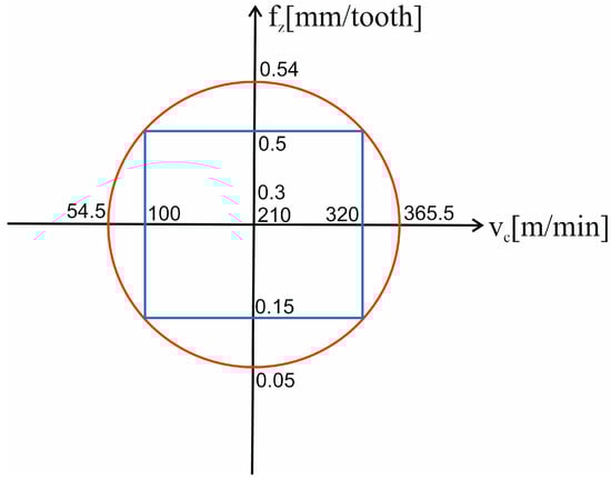 The applied range of cutting speeds used allowed us to determine the central value at 210 m/min. The iteration was set at 110 m/min, which allowed us to obtain point values at 100 m/min and 320 m/min. The length of the square diagonal was 311 m/min (d = a√2, where a = 320 m/min–100 m/min), from which the star point values were 54.5 m/min and 365.5 m/min (values that were half lower and higher the diagonal than the central point value). As for the second parameter, i.e., feed per tooth, the central value was set at 0.3 mm/tooth. After determining the iteration, points with values of 0.15 mm/tooth and 0.5 mm/tooth were obtained. The length of the square diagonal was 0.49 mm/tooth and the star points were 0.05 mm/tooth and 0.54 mm/tooth.