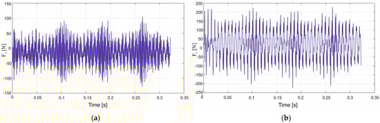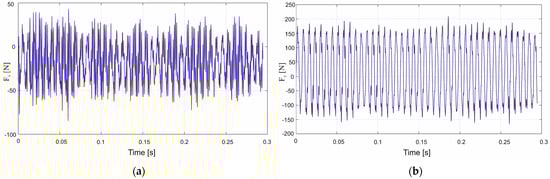 An analysis of the cutting force components was also carried out for the polymer composite with carbon fibers. Examples of the cutting force components Fx and Fy are plotted in Figure 10a,b.