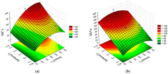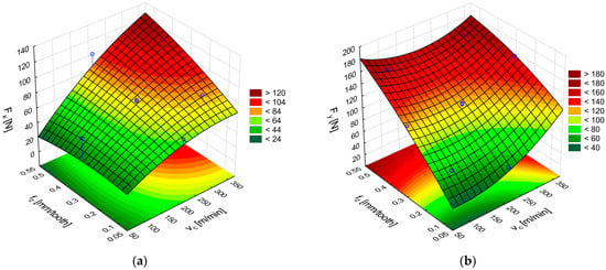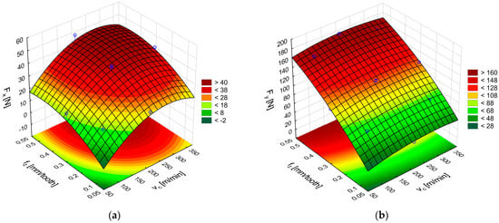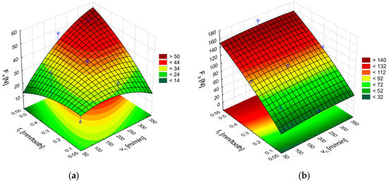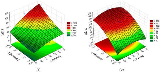 Figure 8a,b shows the response surfaces obtained from the relations in (4) and (5), describing the effects of cutting speed and feed on the cutting force components Fx and Fy, respectively.