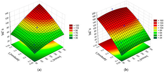 Figure 7a,b shows the response surfaces obtained in milling glass fiber-reinforced plastics with uncoated cemented-carbide cutters. The plots illustrate the effect of feed per tooth and cutting speed on the feed force Fx and the main (tangential) force Fy.