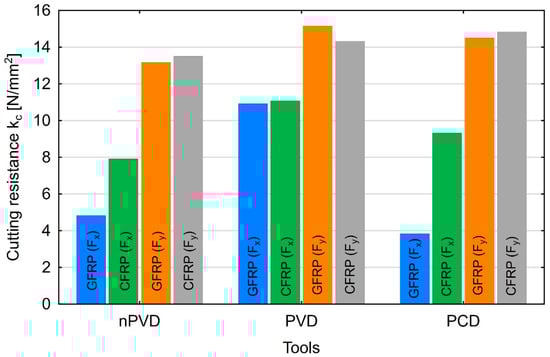 where Fx,y denote the feed and main (tangential) forces, ap is the depth of cut, and ae is the width of the removed layer equal to the cutter’s diameter. The cutting resistances shown in Figure 14 were determined for the highest values of the feed and main (tangential) forces. The x-axis indicates the type of tool, where nPVD denotes the uncoated carbide tool, PVD denotes the PVD-coated carbide tool, and PCD denotes the polycrystalline diamond tool.