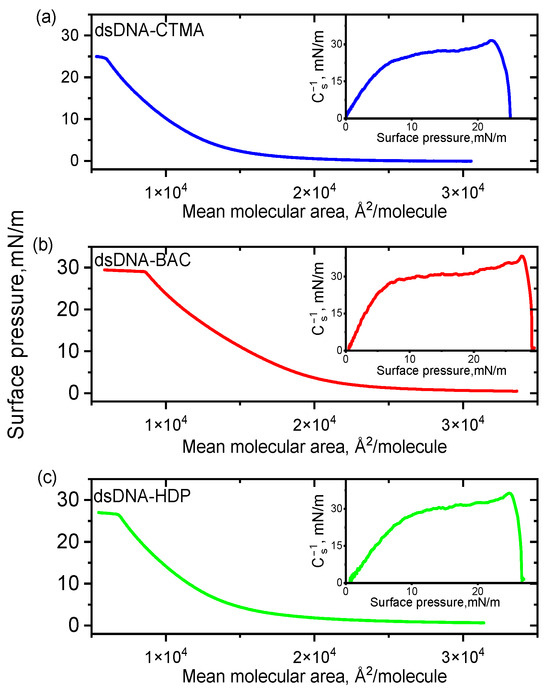 π–A isotherms for dsDNA complexes with cationic surfactants CTMA (a), BAC (b), and HDP (c) spread on water subphase at 20 °C. Insets: compression moduli as a function of surface pressure (π).