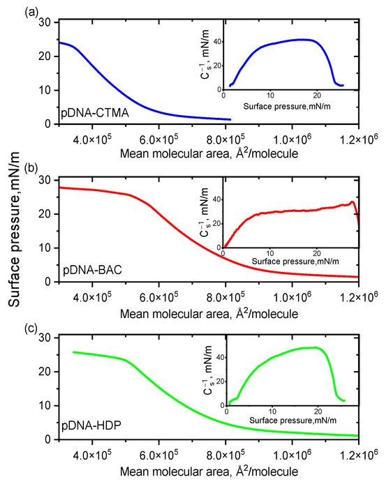 π–A isotherms for pDNA complexes with cationic surfactants CTMA (a), BAC (b), and HDP (c) spread on water subphase at 20 °C. Insets: compression moduli as a function of surface pressure (π).