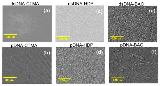 BAM images recorded for dsDNA and pDNA complexes with cationic surfactants CTMA (a,b), BAC (c,d), and HDP (e,f) at collapse pressure πcoll.