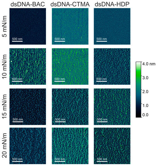 In the case of dsDNA-BAC layers, the spontaneous formation of elongated structures was observed for samples lifted at surface pressures of 10 and 20 mN/m, while their absence was observed for surface pressures of 5 and 15 mN/m. The presence of structures (for pressures of 10 and 20 mN/m) and some periodicity in the direction perpendicular to the direction of sample lifting are well visible in Figure 4. In the case of the dsDNA-HDP complex, the successive formation of elongated structures was observed with increasing surface pressure, similar to the dsDNA-CTMA complex. No disturbance of this trend was observed for the surface pressure of 15 mN/m as it was for dsDNA-BAC (Figure 4).