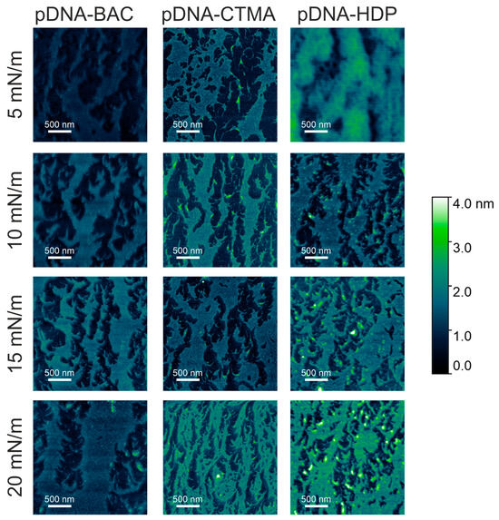 AFM images of plasmid pDNA–based complexes deposited on mica slides obtained from monolayers transferred at different surface pressures. The effect of increasing compression pressure can be observed from top to bottom.