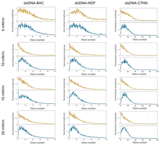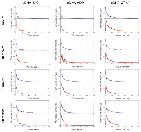 Fast Fourier transform analysis was performed on depth profile data extracted from AFM images (Figure A1). FFT analysis of AFM images in a direction parallel to the sample extraction direction resulted in a monotonic decrease in value, indicating a lack of periodicity. In the graphs of profiles perpendicular to the sample lifting direction, a sharp maximum was observed in the image analysis, which indicated periodicity (see Figure 6 and Figure 7). For all recorded AFM images, complementary FFT analysis was performed, and the occurrence of periodic structures was confirmed for profiles perpendicular to the sample lifting direction, as well as their absence in the parallel direction for all complexes based on plasmid pDNA and part of the complexes based on linear dsDNA.
