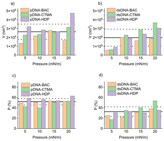 Mean volume of the domains for pDNA-based complexes (a) and dsDNA-based complexes (b) along with the percentage of surface coverage for pDNA-based complexes (c) and dsDNA-based complexes (d) as obtained from representative AFM images. Solid lines indicate the mean values, dashed lines—standard deviation.