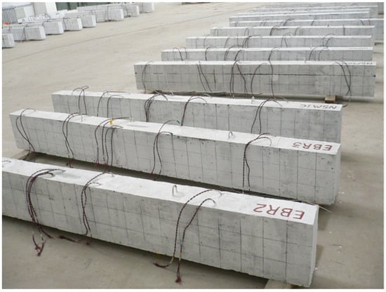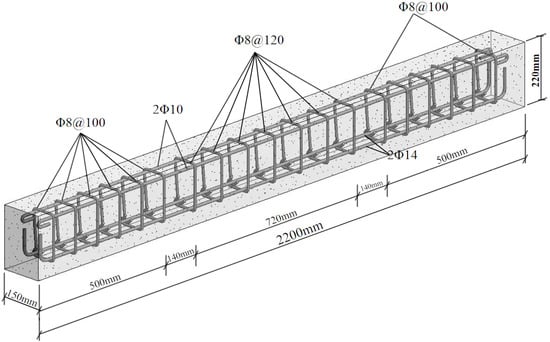 Reinforcing bars. Reinforcing bars were utilized in the construction, including both longitudinal bars and stirrups made of HRB400 steel (Jiujiang Jiangxi, China). Specifically, the lower longitudinal bar had a diameter of 14 mm, with a yield strength of 443 MPa, ultimate strength of 638 MPa, and an elastic modulus of 202 GPa. The upper longitudinal bar (supporting bar) had a diameter of 10 mm, featuring a yield strength of 451 MPa, ultimate strength of 626 MPa, and an identical elastic modulus of 202 GPa. The stirrup, with a diameter of 8 mm, exhibited a yield strength of 445 MPa, ultimate strength of 622 MPa, and an elastic modulus of 201 GPa. The tensile tests for these reinforcing bars were conducted in accordance with the standard (GB/T50010-2010) [29].