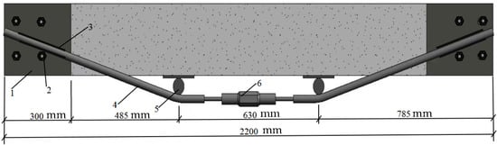 Schematic diagram of the conventional external prestressed reinforcement method. 1—anchored steel plate; 2—high-strength steel plate anchor bolts; 3—foot weld seam; 4—prestressed steel bars; 5—support stick; 6—bidirectional fastening device.