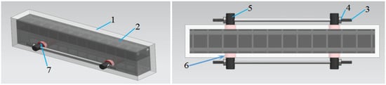 Schematic diagram of the external prestressed reinforcement system. 1—concrete beam; 2—steel reinforcement cage; 3—prestressed steel bars; 4—nut; 5—steel bar; 6—casing hole; 7—steel casing.