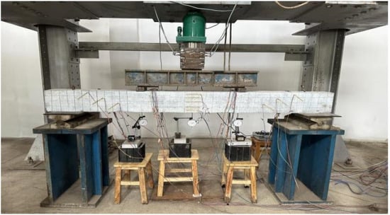 This test was a static load test. Manual hydraulic jacks were employed for stepwise loading, with an initial load increment of 10 kN per step. Upon the formation of visible cracks on the surface of the concrete beam, the load increment was reduced to 5 kN per step until the test beam failed. Each stage of loading and pressure stabilization lasted for 2 min. During this period, test data, including load, displacement, and strain, were recorded, and the crack morphology of the test beam was observed. The test setup is illustrated in Figure 5.