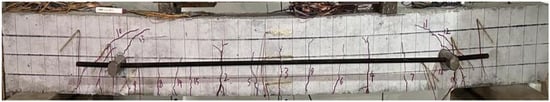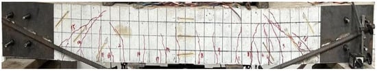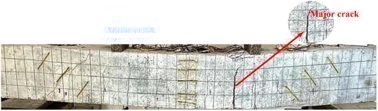 The SRB-100-1 beam was a side facade reinforcement beam subjected to an initial prestress of 100 kN. During the initial loading phase, no significant cracks or deformations were observed on the surface of the beam. When the applied load reached 44.3 kN, a vertical main crack emerged at the mid-span with a width of 0.05 mm and a length of 26 mm. As the load increased, both the number and width of cracks progressively grew. At a load of 63.4 kN, the first inclined crack appeared below the drilling position at the left end of the beam, measuring 0.08 mm in width and 79 mm in length. Upon further loading to 72 kN, the tensile reinforcement began to yield. At 87 kN, the concrete strain gauge located at the lower part of the beam was damaged, and the reinforcing bars entered the strengthening stage. As the load reached 115 kN, the reinforcing bars transitioned into the necking stage, exhibiting pronounced plastic deformation. At 123.7 kN, the width of the main crack widened to 0.5 mm with a length of 98 mm, and the strain in the prestressed tendons intensified. Although the number of cracks stabilized, their widths continued to increase. Ultimately, when the load reached 137.5 kN, the width of the main crack expanded to 5 mm and its length increased to 192 mm. This was accompanied by the spalling of concrete fragments and a sharp increase in beam deflection. The concrete in the compression zone on the right side of the mid-span collapsed, marking an ultimate bearing capacity of 147 kN and resulting in structural failure. The failure pattern of the SRB-100-1 beam is illustrated in Figure 9.