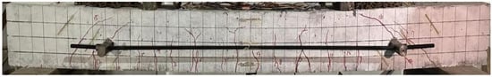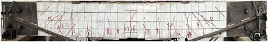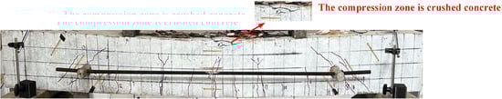 Static load tests were performed on a total of 21 reinforced concrete beams, grouped into seven categories. Based on the overall testing process, the force condition of the beams was categorized into four distinct stages. The first stage corresponds to the elastic phase, during which the stress–strain relationship of the beam remains linear. In this phase, both the concrete and reinforcing steel work together to bear the applied load, without significant deformation. The second stage is characterized by the initiation of concrete cracking. When the tensile stress exceeds the tensile strength of the concrete, cracks begin to form in the tension zone, and the reinforcing steel starts to assume the primary tensile force. The third stage represents the plastic phase, where the reinforcing steel yields, and the tensile capacity of the concrete progressively diminishes. This results in a substantial increase in beam deformation. Finally, the ultimate bearing stage is reached, during which the beam’s bearing capacity approaches its limit. At this point, the concrete in the compression zone fractures, leading to the eventual failure of the beam. Subsequently, a representative beam with distinctive force characteristics was selected from each test group for detailed analysis. The failure mode, crack propagation, and experimental phenomena of these beams are described and analyzed comprehensively.