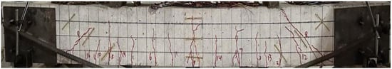 The TRB-40-1 beam was a conventionally reinforced concrete beam subjected to a prestress of 40 kN. During the initial loading phase, no significant deformation or cracking was observed in the beam. When the applied load reached 78.9 kN, an upward-extending crack first appeared at the location of the support bar on the right side of the beam, with a width of 0.04 mm and a length of 29 mm. As the load increased to 86.3 kN, a primary crack emerged in the mid-span tensile zone, characterized by a crack width of 0.05 mm and a length of 30 mm. Upon further loading to 113.5 kN, diagonal cracks developed on the right side of the beam, measuring 0.1 mm in width and 114 mm in length. Concurrently, the width of the primary crack increased to 0.15 mm, while its length extended to 46 mm. At a load of 138 kN, the concrete strain gauge located at the bottom of the beam failed. With the load reaching 191.8 kN, the width of the primary crack expanded to 0.5 mm, with a length of 87 mm. Ultimately, when the load increased to 214.7 kN, the width of the primary crack reached 5 mm, the length extended to 169 mm, and the deflection of the beam exhibited rapid growth, accompanied by substantial structural deformation. The beam ultimately failed when the ultimate bearing capacity of 232.8 kN was reached, resulting in the crushing of the concrete in the compression zone. The failure pattern of the TRB-40-1 beam is illustrated in Figure 12.