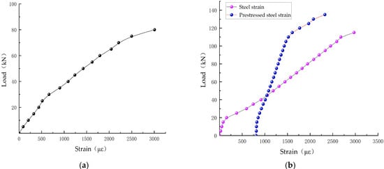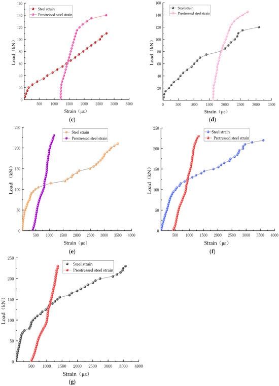 The load–strain curves of the reinforcing bars in concrete beams are presented in Figure 13. When the applied load was relatively low, the strain of the tensile reinforcement in the OB beams increased rapidly, transitioning into the yield stage and indicating a relatively low flexural stiffness. In the SRB beams, the implementation of prestress significantly enhanced the strain behavior of the tensile reinforcement, postponed the onset of yielding, and improved the overall flexural performance. Specifically, for the SRB-100-1 beam, the application of substantial prestress enabled the tensile reinforcement to remain in an elastic deformation state, even under significant loads, thereby effectively enhancing the stiffness and deformation control of the beam. As the level of prestress increased, the flexural stiffness of SRB beams progressively improved. In contrast, the prestressed tendons of the SRB-50-1 beams exhibited nonlinear deformation under lower loads, reflecting the limitations associated with insufficient prestress. Conversely, the prestressed tendons of the SRB-75-1 and SRB-100-1 beams maintained elastic deformation under higher loads, demonstrating superior stiffness and deformation control capabilities. The TRB beam, characterized by a uniform prestress distribution, exhibited a more gradual strain curve for both the tensioned reinforcement and the prestressed reinforcement. Prior to reaching the yield point, it could sustain a considerably larger load, further enhancing its overall bending resistance. Compared to the SRB beams, the prestressed tendons of the TRB beams continued to effectively counteract deformations induced by external forces under high loads, showcasing enhanced stiffness and anti-deformation properties.
