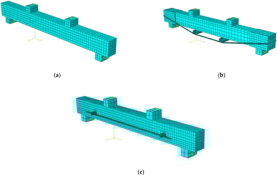 Mesh division diagrams for each model. (a) OB beam grid; (b) TRB beam grid; (c) SRB beam grid.