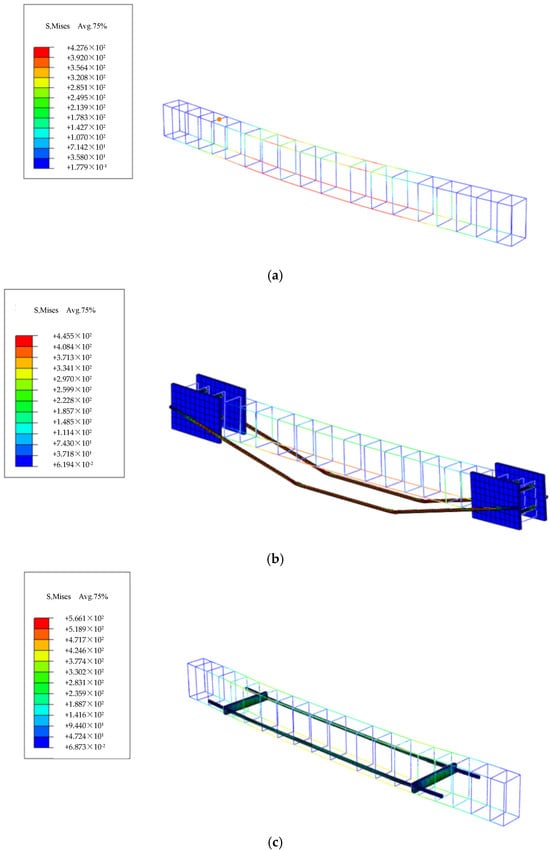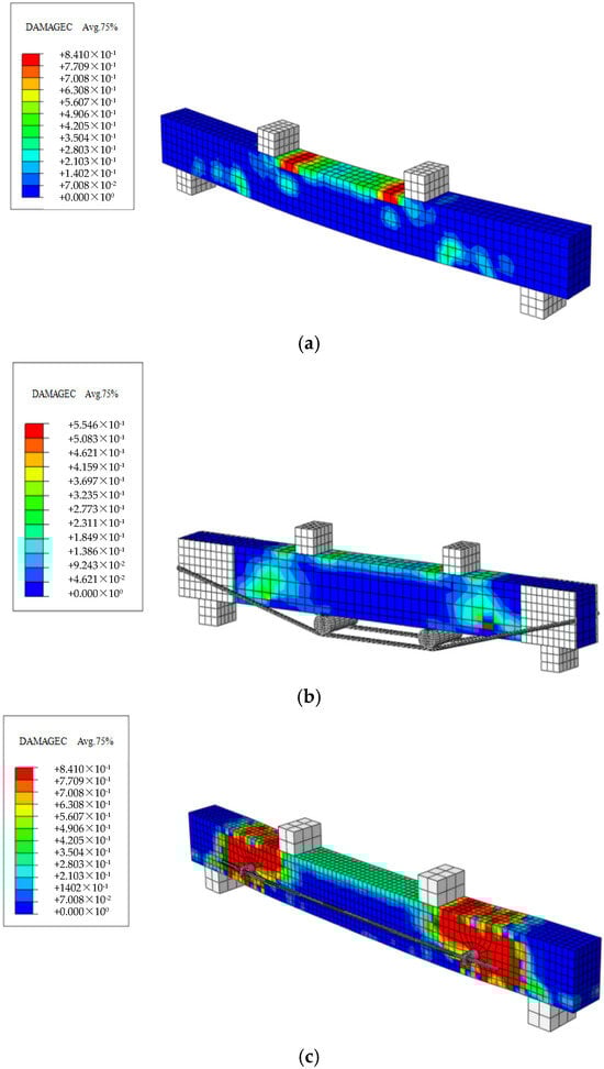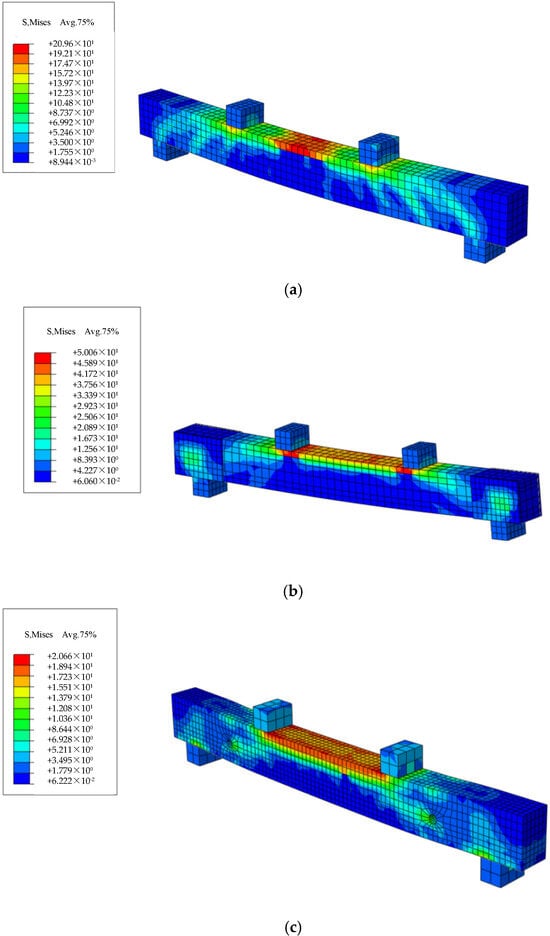 Stress cloud map illustrating simulated beam compressive damage. (a) OB-1; (b) TRB-35-2; (c) SRB-75-1 beam.