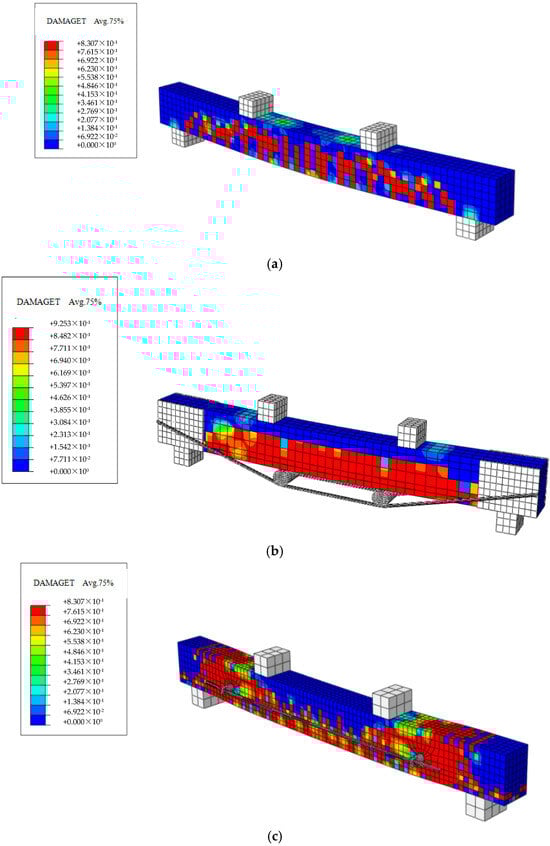 Cloud map illustrating the tensile damage stress distribution in simulated beams. (a) 0B-1 beam; (b) TRB-35-2 beam; (c) SRB-75-1 beam.