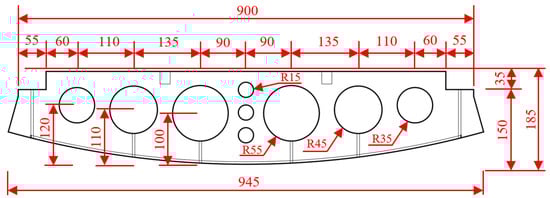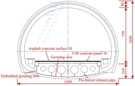 This article is based on a mountain tunnel project in the south of China, where the tunnel form is horseshoe-shaped, as shown in Figure 1. The thickness of the secondary cast-in-place lining of the arch wall is 0.045 m. The inverted arch of the tunnel adopts a prefabricated concrete inverted arch block. The length of a single inverted arch block along the longitudinal direction of the tunnel is 9.45 m, the width of the block is 1.00 m, and the height is 1.85 m. When the inverted arch block is prefabricated, 10.00 m3 concrete is poured at one time, the concrete strength grade is C40, and the weight of the inverted arch block is 25.00 t. The detailed size is shown in Figure 2.