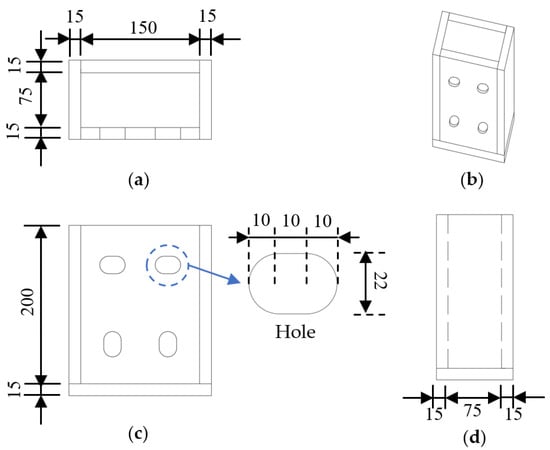 Three views and the three-dimensional structure of the embedded steel box (unit: mm): (a) vertical view, (b) elevation drawing, (c) front view, and (d) side view.