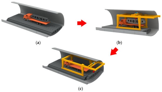 The construction scheme of the assembled inverted arch structure in practical engineering is implemented in [25]. The main processes of inverted arch assembly are transportation, lifting, and assembly, which are detailed in Figure 5. It can be seen from Figure 4 that the prefabricated inverted arch members provide driving conditions for various construction equipment during their assembly process when the secondary lining of the tunnel arch wall has not yet been constructed. Under these conditions, the longitudinal joints may be subjected to shear force or the combined action of shear force and bending moment.