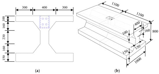 In order to study the mechanical properties of the shear force of the longitudinal joint, three local specimens of the joint were made. The test parameters were the tightening torques of the high-strength bolt, as shown in Table 1, where d is the diameter of the bolt, T is the test tightening torque, and Tc is the standard tightening torque. Considering the conditions of the test site, some structures were intercepted as test bodies according to certain similar conditions on the basis of the prototype structure. The joint force test piece adopted the width of the 1 m range of the longitudinal joint of the inverted arch, while the height direction followed a 1/2 scale of the component. For the opening position of the inverted arch component, the structure was simplified as an I-section. Dimensional analysis determined the similarity coefficients of the local joint specimen and the original structure in geometry, physics, and mechanics. The specific geometric dimensions and structures are shown in Figure 6.