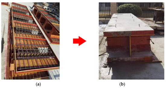 The test specimens consisted of two identical components connected by bolts. As shown in Figure 7, specimen fabrication began with template assembly according to a single component’s size and structure, followed by steel cage placement and concrete pouring. After forming, the prefabricated components underwent water curing under natural laboratory conditions. Following 28 days of maintenance, component assembly and combination were performed, with test torque applied to high-strength bolts using a torsion wrench. When the bolts were tightened, a standard tightening torque of about 30% was applied to all bolts, and then the torsion force was applied to the diagonal bolts to the target value.