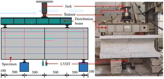 The test was carried out under the 2000 KN electro-hydraulic servo-loading system with a load accuracy of ±1% full scale and a displacement accuracy of ±0.5% full scale. The arrangement of the loading device and displacement meter is shown in Figure 8. During testing, the steel beam was used to control the load of the loading point, so as to achieve the same ratio of the forces of the two loading points and keep the joint in the pure shear state. Two rebound displacement sensors (LVDTs) were installed near the bottom joint of the specimen, with one placed on each side of the joint. The probe tips of the LVDTs were in contact with the underside of the specimen, while their bases were fixed to the ground. Each LVDT had a measuring range of 50 mm and a linear accuracy of ±0.1%. Calibration tests indicated that the measurement error was within ±0.01 mm. No significant drift or hysteresis was observed throughout the loading process.