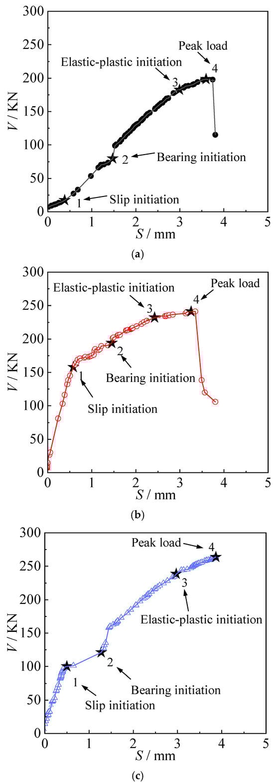 Elastoplastic stage: In this stage, even a small increase in load resulted in a rapid growth of shear deformation in the connection, ultimately leading to joint failure. The peak point “4” on the load–slip curve represents the ultimate load-bearing capacity of the longitudinal arch joint. After reaching this peak, the bolts failed abruptly in a brittle shear mode, causing a sharp drop in load. Due to the sudden nature of this failure, the descending branches of the curves were difficult to capture accurately for all specimens, as shown in Figure 10.
