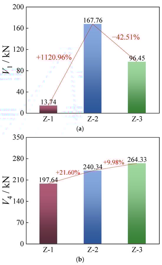 To further investigate the influence of tightening torque on the shear performance of longitudinal arch joints, the frictional limit load and bearing limit load were selected as characteristic indicators of shear capacity. A comparison of the frictional limit load V1 and the bearing limit load V4 for each joint is presented in Figure 11.