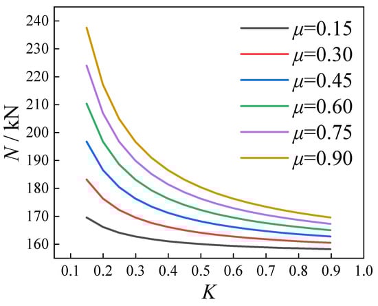 The influence of different friction coefficients (μ) and torque coefficients (K) on the calculation results was investigated, as illustrated in Figure 12. It can be observed that when the torque coefficient was low, variations in the friction coefficient led to significant changes in the calculated results. In contrast, when the torque coefficient was high, the impact of the friction coefficient on the calculation results became progressively smaller.