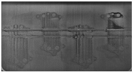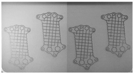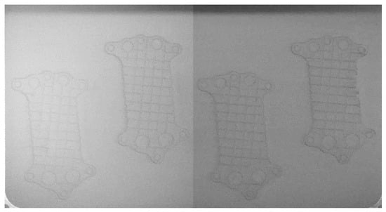 For classification purposes, the dataset was prepared using raw images taken during the building process (Figure 1 and Figure 2). These images were assembled from two cameras; hence, a vertical line is visible in the middle of each combined image. The cameras were positioned inside the chamber, oriented normally to the powder bed, ensuring stable lighting conditions for each layer. Due to the normal direction across the layers, there was no need for perspective transformation, as was required for equipment placed outside the chamber [20]. During the labeling process, each image was divided into two parts and adjusted for contrast to ensure that images from the two cameras were standardized. The horizontal shadow in the upper section of the images was removed, resulting in no adverse impact on overall performance. All images were captured in grayscale. The pixel represents a square of 177 × 177 µm.
