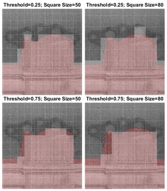 In Figure 4, the transformation is illustrated for four sets of parameter pairs. It is evident that a larger square size results in a coarser grid. Additionally, a higher threshold value tends to exclude a significant number of pixels marked as “ERROR”. In the dataset-creation process, a square size of 50 pixels and a threshold of 0.25 was used (as shown in the image in the upper-left corner of Figure 4). Further research could be conducted to explore the optimal values for square size and threshold. For this paper, the square size and the threshold have been selected based on empirical assessment. The whitened squares indicate the “ERROR” label.