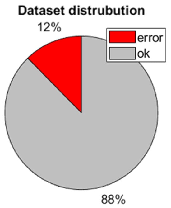 Figure 5 presents the label distribution for the dataset. As a piece of pre-work, 10% of the master database was labeled using the prior approach, resulting in the same distribution of the labels. The labeling process using a pixel-wise approach turns out to be around 20 times faster than labeling squares. It is an imbalanced dataset; thus, there is a risk that the prediction algorithm can favor the OK class and ignore the ERROR class. The problem is described more widely in Section 2.4.